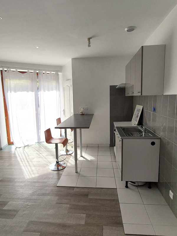 La pièce de vie de 25 m² associe confort et convivialité avec sa cuisine ouverte sur le salon-séjour, tandis que la chambre de 12 m² est dotée d’un placard intégré, alliant praticité et espace de rangement.